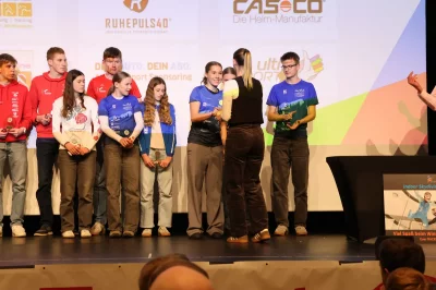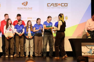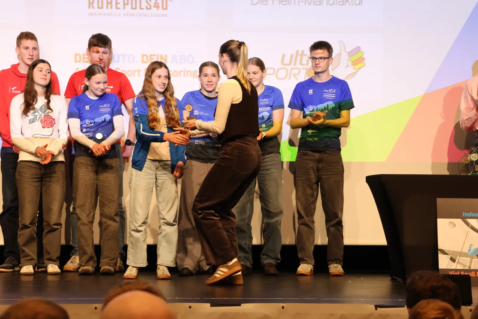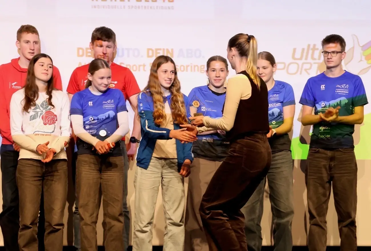 Besondere Ehrung für Athleten der Turnerschaft Langenau bei der Triathlon-Gala des Baden-Württembergischen Triathlon-Verbandes in Uhingen, Landkreis Göppingen. Geehrt für ihre besonderen Leistungen beim RACEPEDIA-Cup wurden Isabella Otte, Heidi Schmidt, Johanna Otte, Lea Bächle und Michael Selzer. Besonders vorgehoben wurden dabei auch der dritte Platz bei den Deutschen Jugendmeisterschaften von Heidi Schmidt und der sechste Platz von Johanna Otte. Mit dem Team Baden-Württemberg wurden sie Vize-Meister. Michael Selzer wurde mit dem Team Baden-Württemberg 3 bei der DM. Turnerschaftsathleten in Blau Von links: Isabella Otte, Heidi Schmidt, Johanna Otte und Michael Selzer. Geehrt wurden sie von der Profi Athletin Marlene Gomez-Göggel