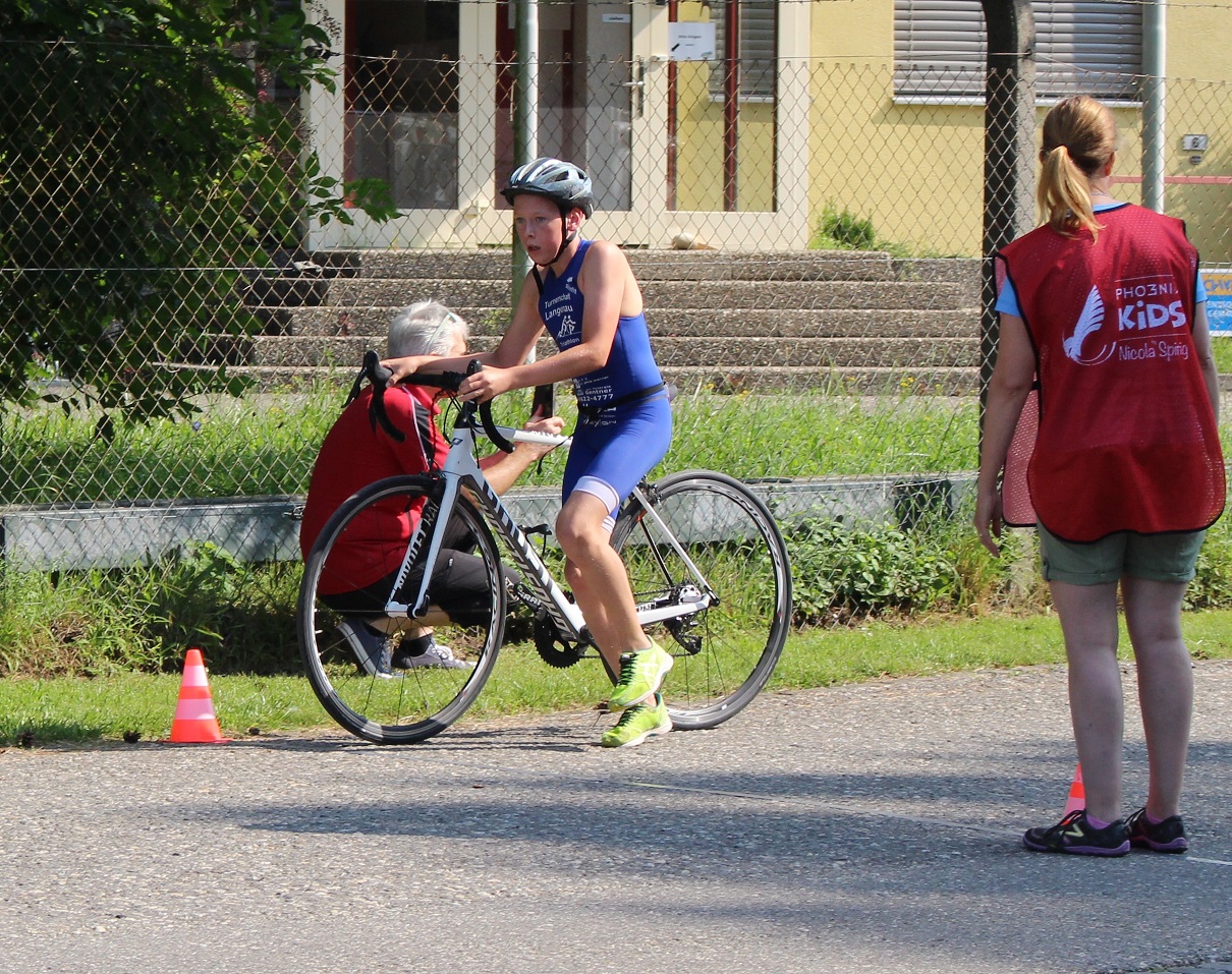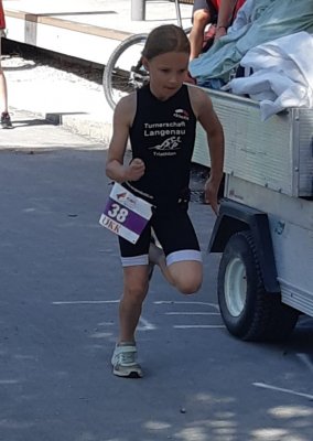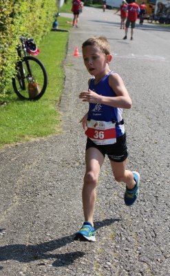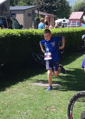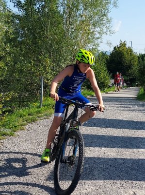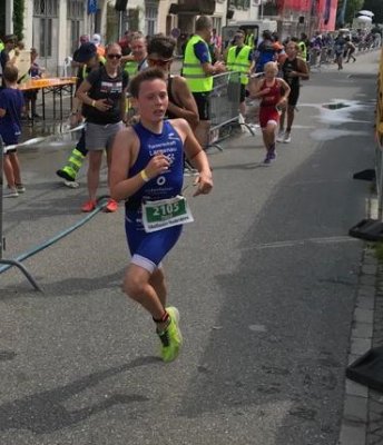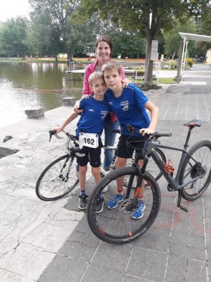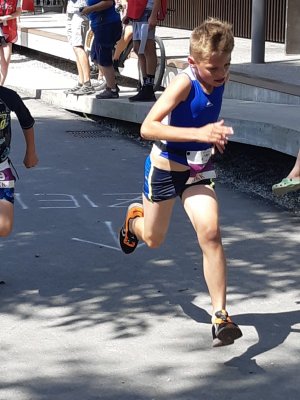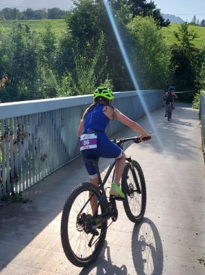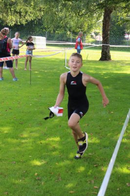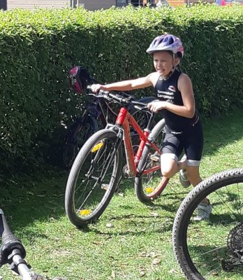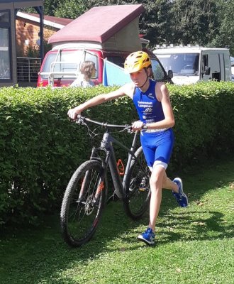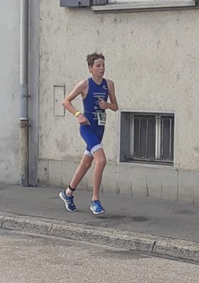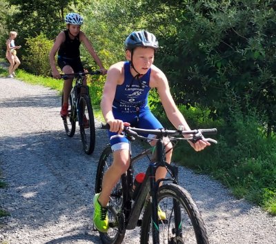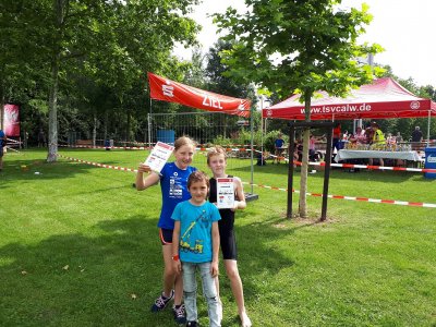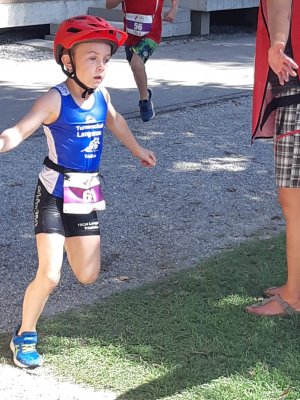 Die Athleten hatten anspruchsvolle Rad- und Laufstrecke mit ordentlichen Steigungen zu bewältigen. Sophie Winter durfte 50 Meter Schwimmen, 1500 Meter Radfahren und 400 Meter Laufen. Sie kam nach dem Schwimmen als erste aus dem Wasser, hatte in der Wechselzone aber leider ihr Fahrrad übersehen und dadurch wertvolle Zeit verloren. So ist sie dann als zweite auf die Radstrecke und hat die bisherige Seriensiegerin in ihrer Altersklasse aus Calw vor sich hergetrieben. Am Ende kam sie in einem Fotofinish mit 0,5 Sekunden Rückstand auf Platz 2. Ben Winter setzte sich von Anfang an die Spitze und behauptete diese Führung bis ins Ziel. Er durfte 25 Meter Schwimmen, 1500 Meter Radfahren und 300 Meter laufen.